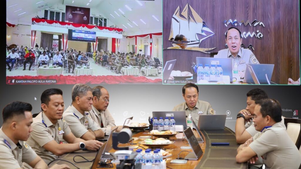 Palopo – Kepala Kantor Wilayah Badan Pertanahan Nasional (BPN) Provinsi Sulawesi Selatan menghadiri secara daring kegiatan Deklarasi Kota Palopo sebagai Kota Lengkap Secara Spasial yang diselenggarakan oleh Kantor Pertanahan Kota Palopo. Kegiatan tersebut dilaksanakan di Aula Ratona Kantor Wali Kota Palopo dan diikuti melalui Zoom Meeting sebagai bagian dari percepatan penyelenggaraan data pertanahan dan tata ruang yang terintegrasi, akurat, dan berkelanjutan (29/12/2025).